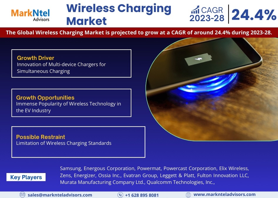 MarkNtel Advisors, a leading market research and consulting firm, has announced the release of its latest study titled Wireless Charging Market Research Report: Forecast (2023-2028). This report provides a detailed assessment of the Wireless Charging Market, covering its evolving dynamics, emerging trends, key growth drivers, major challenges, and competitive landscape.