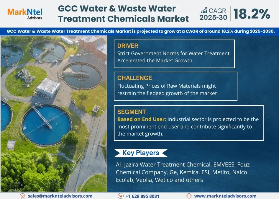 MarkNtel Advisors, a leading market research and consulting firm, has announced the release of its latest study titled GCC Water & Waste Water Treatment Chemicals Market Research Report: Forecast (2025-2030). This report provides a detailed assessment of the GCC Water & Waste Water Treatment Chemicals Market, covering its evolving dynamics, emerging trends, key growth drivers, major challenges, and competitive landscape.