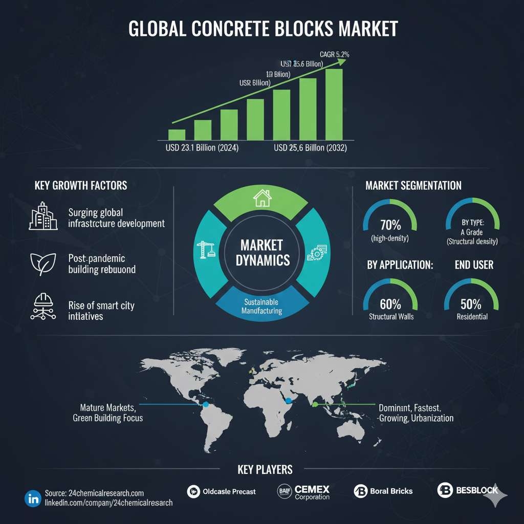 Valued at USD 23.1 billion in 2024, the global concrete blocks market is projected to grow from USD 24.8 billion in 2025 to USD 35.6 billion by 2032, advancing at a compound annual growth rate (CAGR) of 5.2%. This steady expansion is underpinned by the material's inherent advantages: superior durability, fire resistance, thermal insulation, and cost-effectiveness compared to traditional brick masonry. While residential construction remains the dominant end-user, increasing investment in public infrastructure and commercial real estate is broadening demand. The industry, however, navigates challenges like raw material cost volatility and the pressing need for sustainable manufacturing.