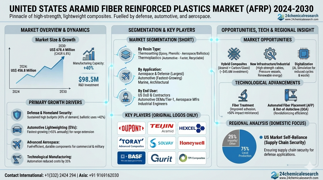 The US AFRP market, valued at US$ 456.8 million in 2024, is on a robust growth trajectory, projected to reach US$ 678.4 million by 2030 at a CAGR of 6.8%. This growth is powered by significant domestic investments, with manufacturing capacity expanding by 40% and the industry injecting approximately $98.5 million into composite technology R&D. Defense applications anchor the market, constituting about 45% of demand, while automotive lightweighting—especially for electric vehicles (EVs)—is the fastest-growing segment, expanding at an annual rate of 55%.