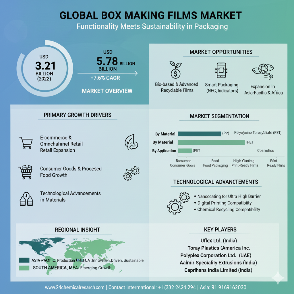 Valued at USD 3.21 billion in 2024, the global box making films market is poised for robust growth, projected to reach USD 5.78 billion by 2032 at a CAGR of 7.6%. This expansion is fundamentally linked to the explosive growth of e-commerce, which demands durable, lightweight packaging, and a global regulatory push towards sustainable, circular packaging solutions that reduce plastic waste.