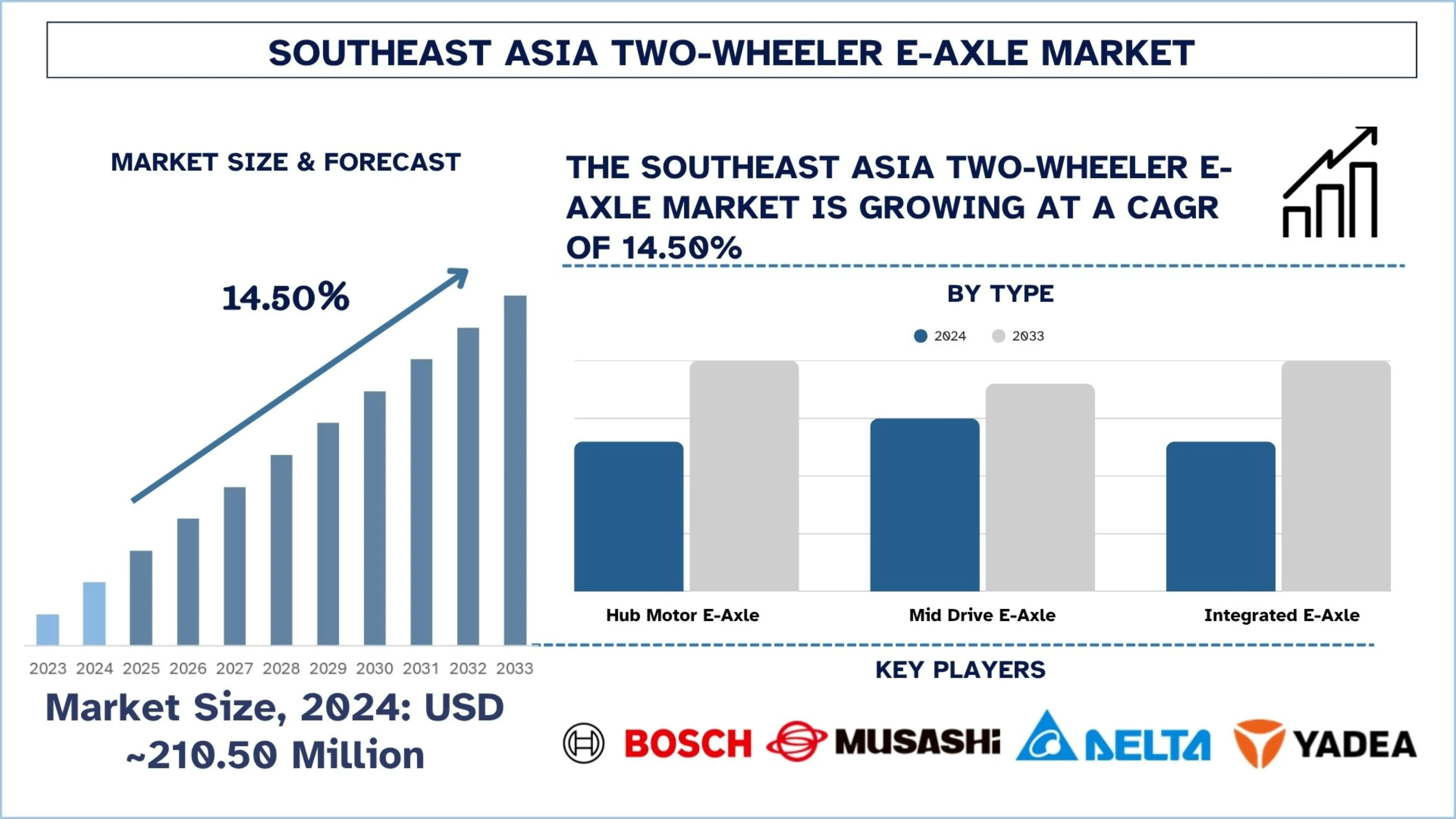 According to UnivDatos, rising electric two-wheeler adoption across urban Southeast Asia, government incentives supporting EV manufacturing and consumer purchases, expansion of battery swapping infrastructure for two-wheelers, increasing demand for low-cost urban mobility solutions, rapid growth of e-commerce and last-mile delivery fleets, localization of EV component manufacturing in ASEAN countries, shift from conventional hub motors to integrated drive systems drive the Southeast Asia Two-wheeler E-Axle market. As per their “Southeast Asia Two-wheeler E-Axle Market” report, the market was valued at USD 210.50 Million in 2024, growing at a CAGR of about 14.50% during the forecast period from 2025 to 2033 to reach USD Million by 2033.