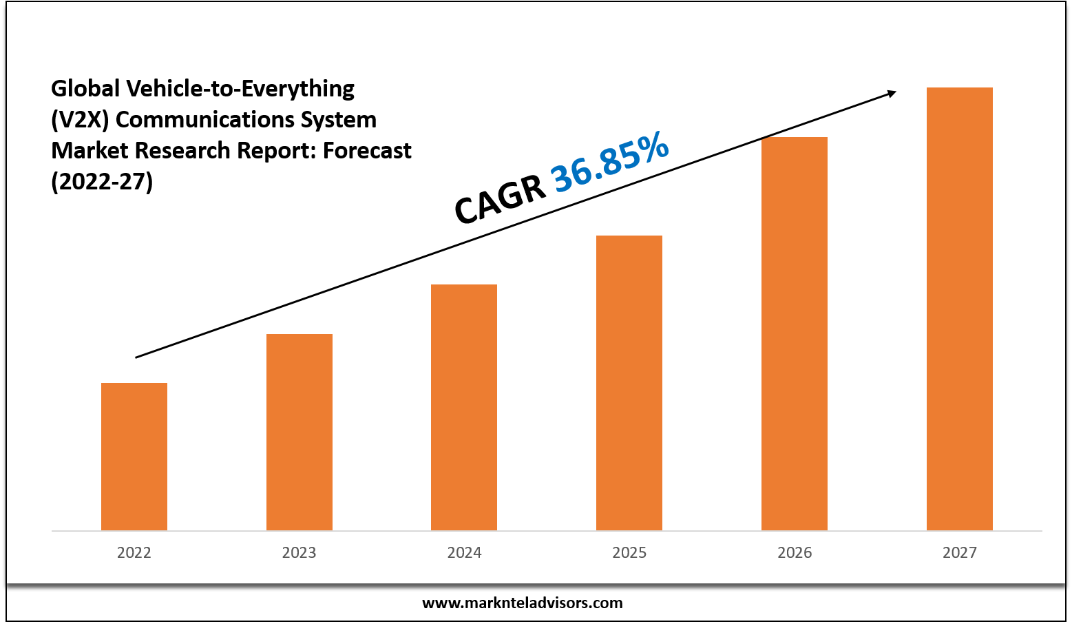 The growth of Vehicle-to-Everything (V2X) Communication System market is estimated at a CAGR of around 36.85% during the forecast period 2022-2027.