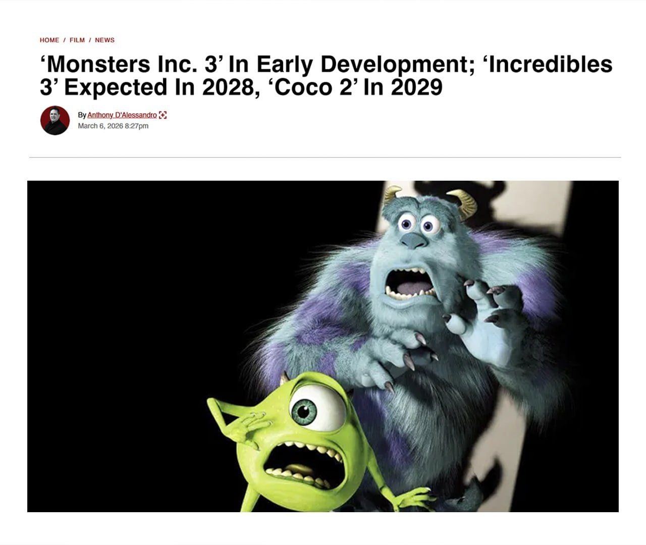 Официально подтверждено: «Корпорация монстров 3» находится в разработке. Эту новость сообщил Wall Street Journal в рамках подробной статьи о внутренних процессах Pixar. Кроме того, ожидаются «История игрушек 5» и «Суперсемейка 3».Официально подтверждено: «Корпорация монстров 3» находится в разработке. Эту новость сообщил Wall Street Journal в рамках подробной статьи о внутренних процессах Pixar. Кроме того, ожидаются «История игрушек 5» и «Суперсемейка 3».· 0 Commenti ·0 condivisioni ·85 Views