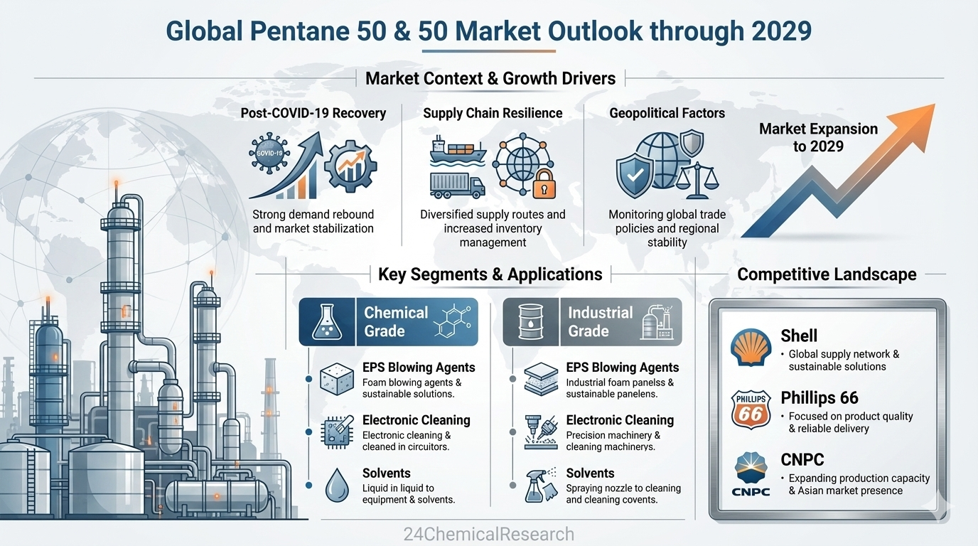 The Global Pentane 50 & 50 market powers essential industrial applications, with Chemical Grade and Industrial Grade segments driving demand in EPS blowing agents, electronic cleaning, and solvents. Key players like Shell, Phillips 66, and CNPC dominate, navigating COVID-19 recovery and geopolitical challenges to fuel expansion through 2029.